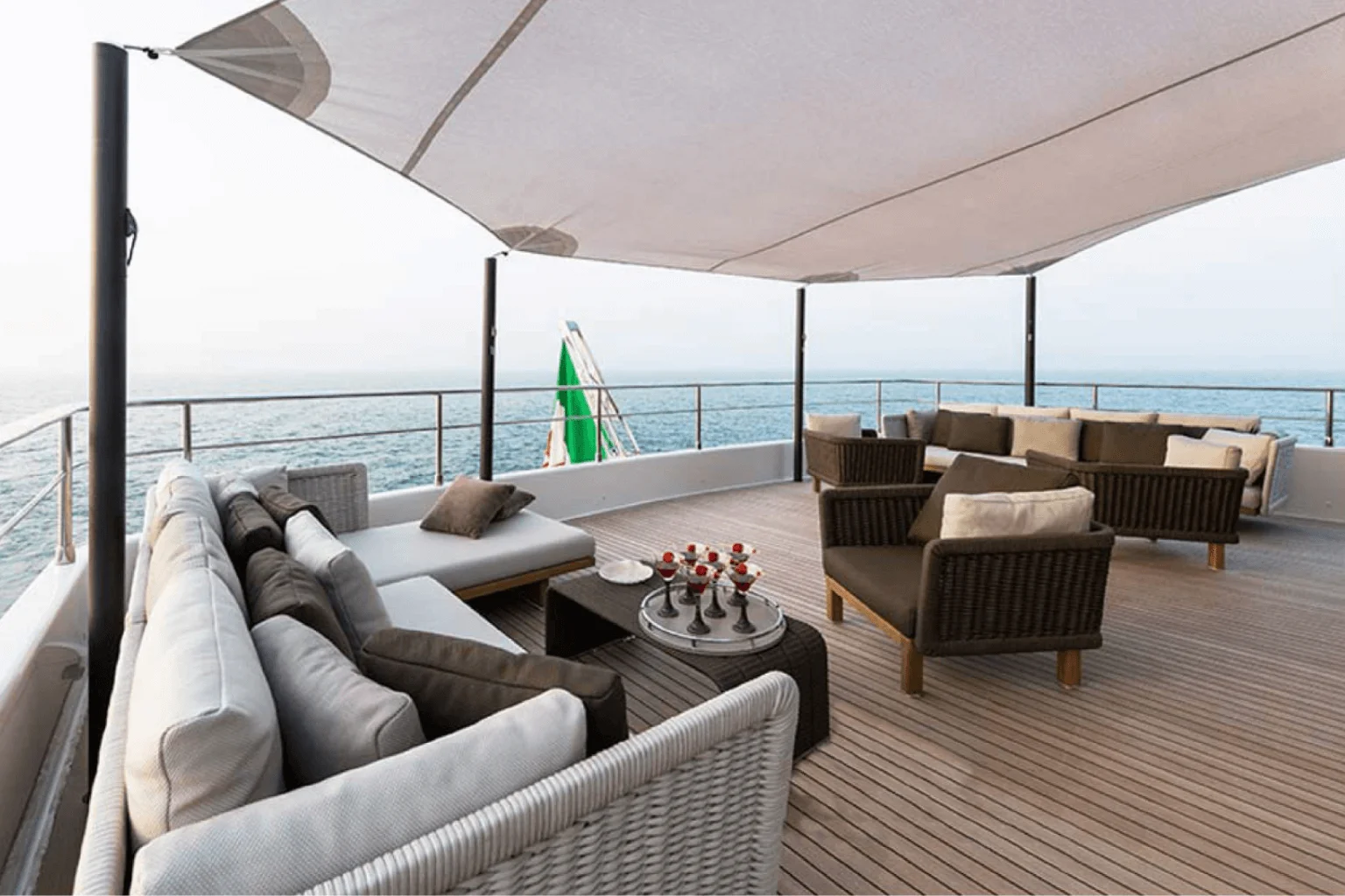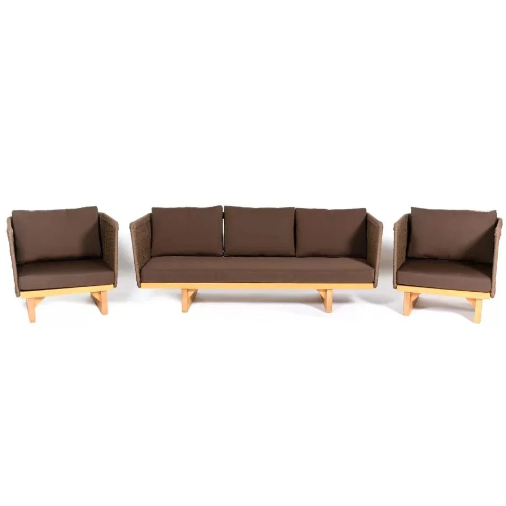 Komplektas yra pagamintas iš kokybiškų, oro sąlygoms atsparių medžiagų. Baldo dizainas fokusuojasi į erdvią terasą, kur jis galėtų tapti puikus eksterjero akcentas. Rėmas yra pagamintas iš tikmedžio, kuris yra ypač tvirtas ir sunkiai nudėvimas. Tai medžio tipas pasižymintis savo patvarumu, dažnai naudojamas prabangių jachtų gamyboje.